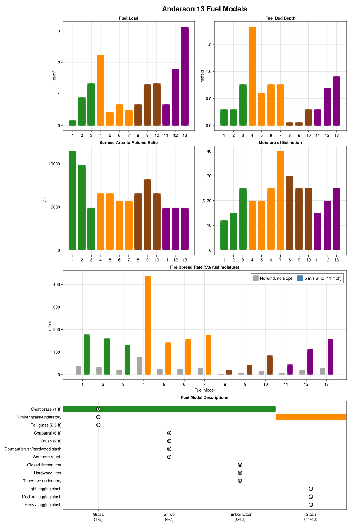 The Anderson 13 fuel models are standard classifications used in fire behavior prediction. Each model has properties that determine how fire spreads: fuel load, depth, surface-area-to-volume ratio, and moisture of extinction.