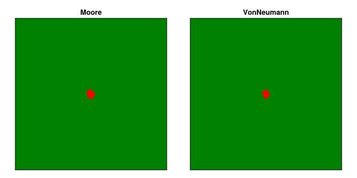 Two neighborhood types control which cells can spread fire: